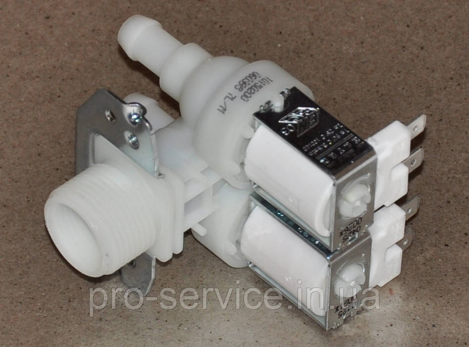 Електромагнітний клапан залива води (або заливний клапан, клапан подачі води, вхідний клапан) C00021864 здвоєний, виходи з поворотом на 90° для пральних машин італійської фірми Indesit Company та її теперішнього власника американської корпорації Вірпул (Whirlpool Corporation): Indesit, Ariston, Scholtes, O.E.M. Якість OEM, інакше це original, АЛЕ без фірмової упаковки. Інші можливі коди та позначення клапана C00021864: 482000072897, 481981729012, 481981729327.